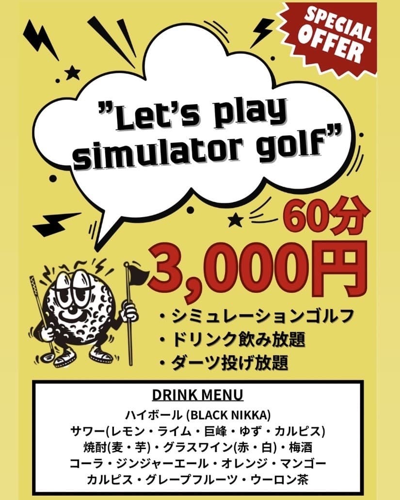 シュミレーションゴルフブースではお酒を飲みながら大人のプライベート空間を満喫できます。おいしいお酒とともに横幅4メートルの巨大ワイドスクリーンで楽しむゴルフ。